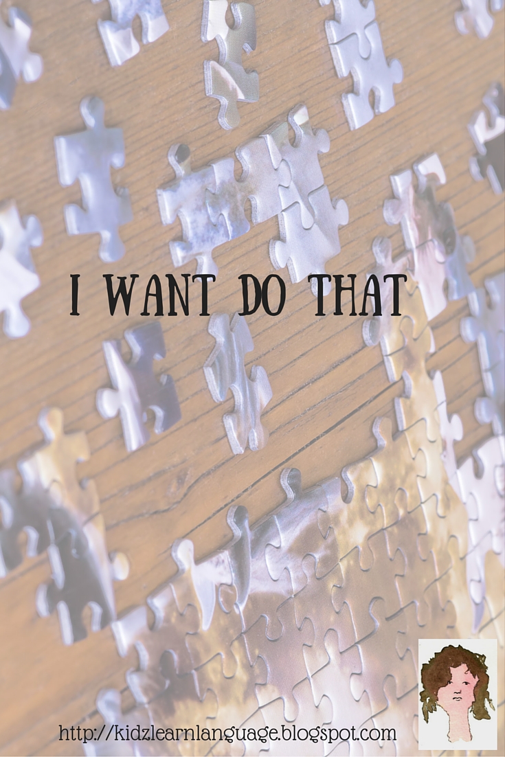 “Do you want…?” I turned to the toys and games page and raised my eyebrows (that "expectant" look). He pointed to “puzzle.” I found a stack of puzzles in the corner. “Do you want that?” I asked. He found the one he wanted. “You want that,” I confirmed. He pointed to “puzzle” again, so I modeled “want puzzle” for him, and he repeated the phrase for me.